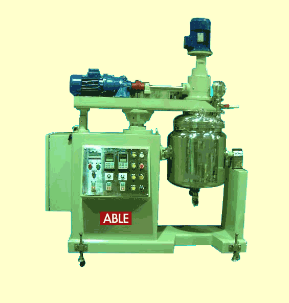 The patented AVG Series of homogenizing mixers from Able Asia America, with counter-rotating blades and high speed turbines, are perfectly suited to a wide variety of pharmaceutical and cosmetic applications, including toothpaste, creams, ointments, and chemical pastes. These highly-specialized mixers feature three top-entering coaxial agitators, including an anchor-agitator with internal counter-rotating blades, a central homogenizing turbine, and self-adjusting Teflon scrapers. They are available with vacuum and heating or cooling systems in capacity sizes from 10 to 4,000 liters. [Planetary Mixers] [Powder Mixers/Holding Tanks] [Total Plant Solutions] |